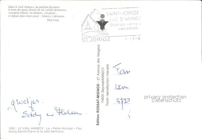 12230002 carte postale Le Vieil Annecy Petite Horloge Faubourg Sainte Claire et la cote Nemours postalisch gelaufen Erhaltung siehe scans KatCode: 11170074174010