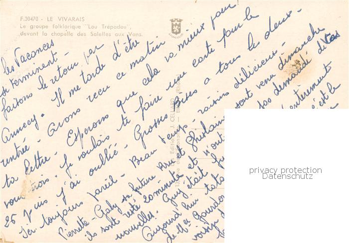13790515 Le Vivarais 07 Ardeche Le groupe folklorique Lau Trepadou devant la chapelle des Salettes aux Vans postalisch nicht gelaufen Erhaltung siehe scans [WerneD78] Wern Katcode 11170007107019