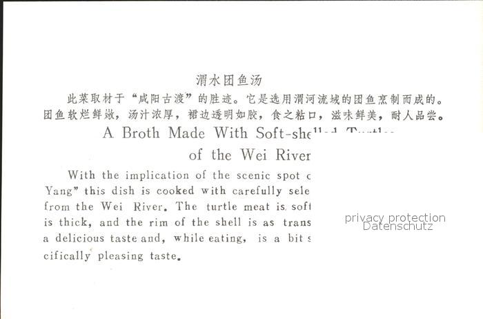 Lebensmittel Broth with Soft-shelled Turtlesof the Wei River China postalisch nicht gelaufen Keine Postkarte (siehe scan) Erhaltung siehe scans