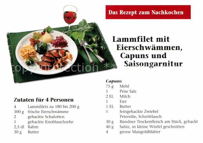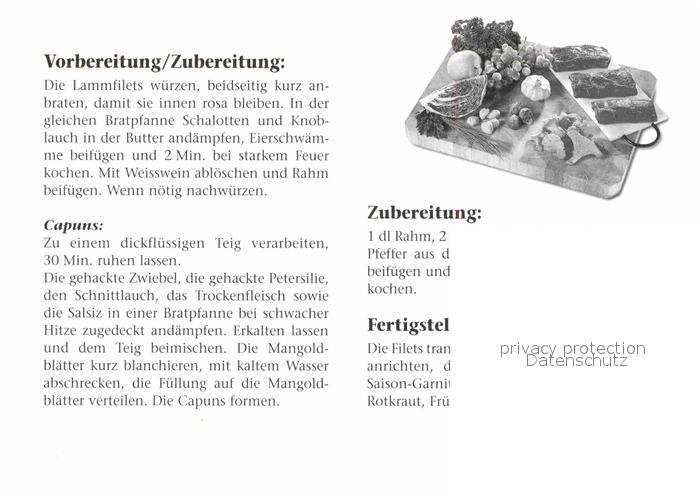 Lebensmittel Lammfilet mit Eierschwaemmen Capuns Rezept postalisch nicht gelaufen Keine Postkarte (siehe scan) Erhaltung siehe scans [PaolaD17]