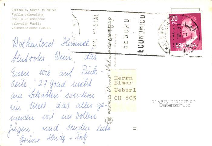 alte Postkarte Lebensmittel Paella Valenciana Valencia postalisch gelaufen Erhaltung siehe scans [PaolaD17]