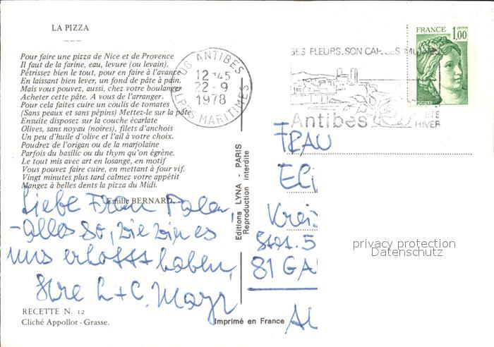 alte Postkarte Lebensmittel Pizza Provencale Rezept postalisch gelaufen Erhaltung siehe scans [PaolaD17 kt110box]