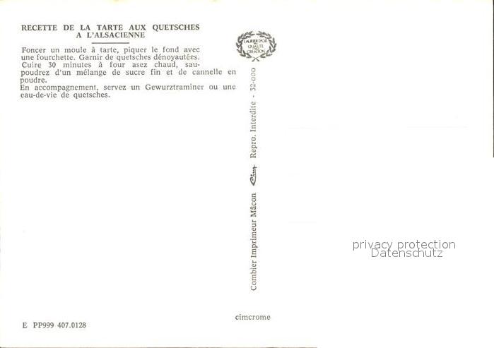 Lebensmittel Recette Tarte aux Quetsches a l’Alsacienne postalisch nicht gelaufen Erhaltung siehe scans