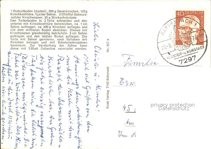 alte Postkarte Lebensmittel Rezept Schwarzwaelder Kirschtorte postalisch gelaufen Erhaltung siehe scans