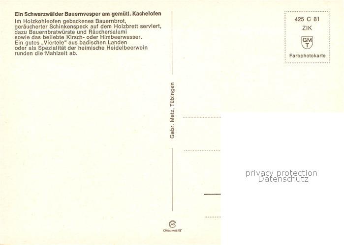 Lebensmittel Schwarzwald Bauernvesper Kachelofen Bauernbrot Schinkenspeck postalisch nicht gelaufen Erhaltung siehe scans [PaolaD17]