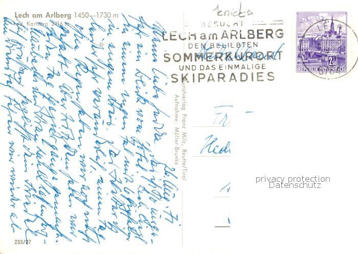 72935573 alte Postkarte Lech Vorarlberg Ortsmotiv mit Kirche Brunnen Blick zum Karhorn Lechquellengebirge postalisch gelaufen Erhaltung siehe scans [FriedD77] KatCode: 11390341080113