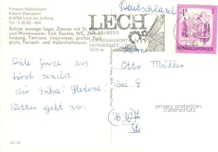 13326184 alte Postkarte Lech Vorarlberg Pension Walkerbach postalisch gelaufen Erhaltung siehe scans [KathaD81] KatCode: 11390341080113