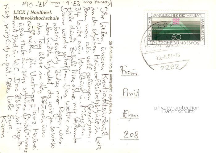73105344 alte Postkarte Leck Heimvolkshochschule postalisch gelaufen Erhaltung siehe scans [WerneD78] KatCode: 11110001054076