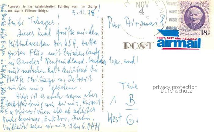 72763591 old postcard Lees Summit Approach to the Administration Building over Charles and Myrtle Fillmore Bridge postalisch gelaufen Erhaltung siehe scans [LiesaD40] KatCode: 14140270000000