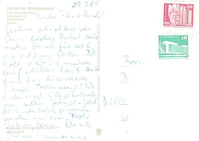 73895801 alte Postkarte Lehnin Otto Nuschke Platz Ortsansicht Muehlenteich Kloster postalisch gelaufen Erhaltung siehe scans [FriedD77] KatCode: 11110012069306