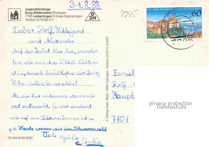 74104301 alte Postkarte Leibertingen Jugendherberge Burg Wildenstein Kapelle Bodenschach Partie an der Donau postalisch gelaufen Erhaltung siehe scans [FriedD77] KatCode: 11110008437072