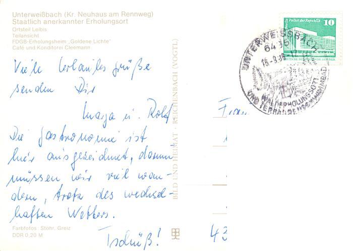 73914143 alte Postkarte Leibis Teilansicht FDGB Erholungsheim Goldene Lichte Cafe und Konditorei Cleemann postalisch gelaufen Erhaltung siehe scans [WerneD78] KatCode: 11110016073094
