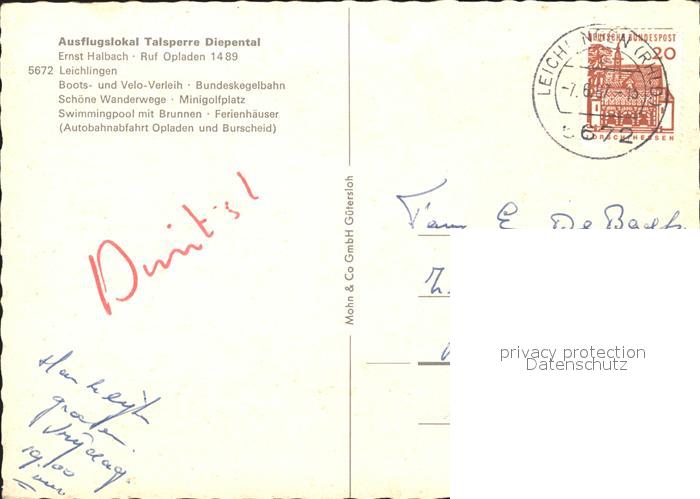 72273199 alte Postkarte Leichlingen Rheinland Ausflugslokal Talsperre Diepental postalisch gelaufen Erhaltung siehe scans KatCode: 11110005378016