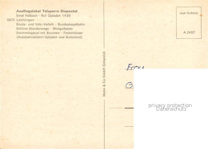 73634965 Leichlingen Rheinland Ausflugslokal Talsperre Diepental Gondelteich postalisch nicht gelaufen Erhaltung siehe scans [WerneD78] KatCode: 11110005378016