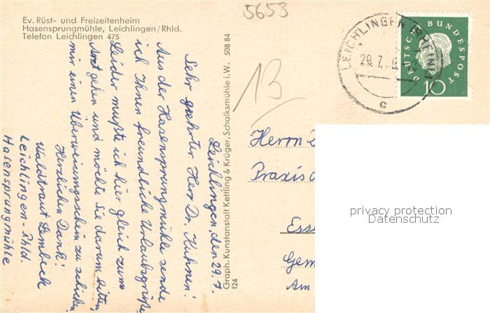 73695701 alte Postkarte Leichlingen Rheinland Ev. Ruest-und Freizeitheim Hasensprungmuehle postalisch gelaufen Erhaltung siehe scans [LiesaD40] KatCode: 11110005378016