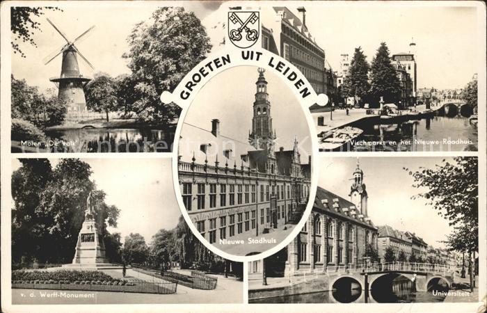 old postcard Leiden Molen De Valk Werff Monument Universiteit Stadhuis postalisch gelaufen Erhaltung siehe scans