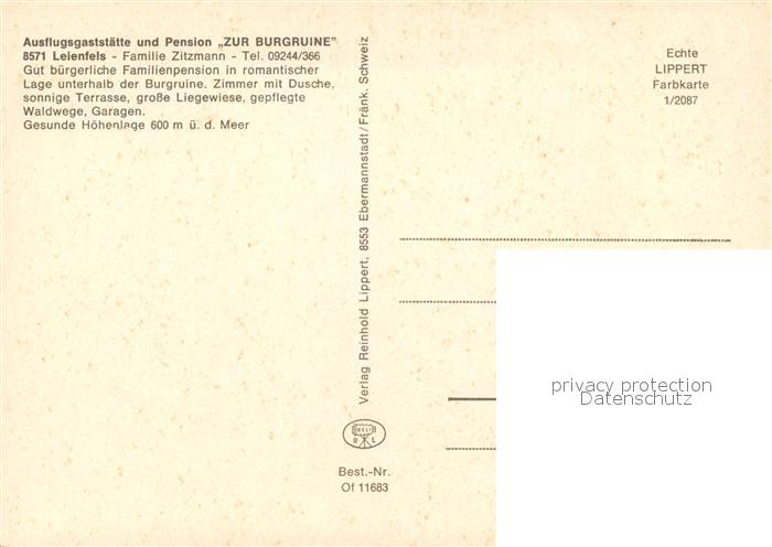 73087582 Leienfels Ausflugsgaststaette Pension Zur Burgruine postalisch nicht gelaufen Erhaltung siehe scans [KathaD81] KatCode: 11110009472179