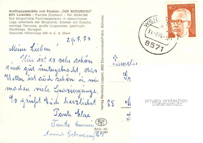 72698778 alte Postkarte Leienfels Panorama Blick ins Trubachtal Ruine Ausflugsgaststaette Pension Zur Burgruine postalisch gelaufen Erhaltung siehe scans [FriedD77] KatCode: 11110009472179