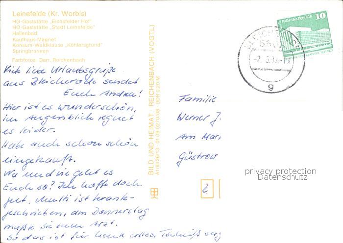 72135927 alte Postkarte Leinefelde HO Gaststaette Hallenbad Kaufhaus Konsum Waldklause Springbrunnen postalisch gelaufen Erhaltung siehe scans KatCode: 11110016061115