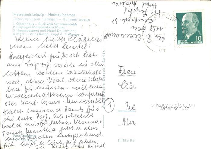 alte Postkarte Leipzig Opernhaus Schwanenteich Messeamt Markt Postamt Hotel Deutschland Altes Rathaus Alte Waage Messestadt Nachtaufnahmen postalisch gelaufen Erhaltung siehe scans