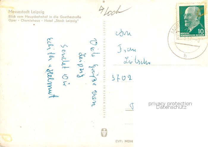 73148418 alte Postkarte LEIPZIG Sachsen Blick vom Hauptbahnhof in die Goethestrasse Oper Chemiehaus Hotel Stadt Leipzig postalisch gelaufen Erhaltung siehe scans [FriedD77] KatCode: 11110014365000