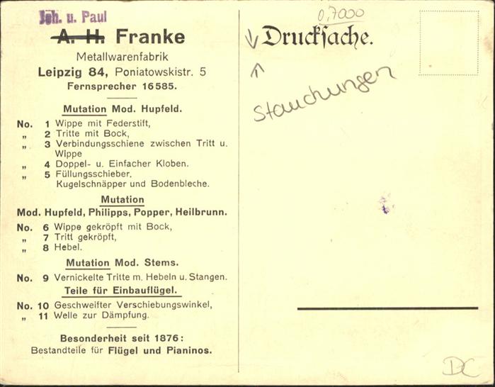 40968506 LEIPZIG Sachsen Fluegeldeckel Schliesshaken Klaviatur Abstelleinrichtung A.H. Franke Metallwarenfabrik postalisch nicht gelaufen Alte Ansichtskarte Postkarte Katcode 11110014365000