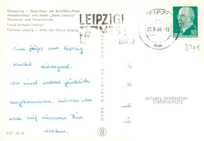 73044826 alte Postkarte LEIPZIG Sachsen Georgisring Opernhaus Hauptbahnhof und Hotel Stadt Leipzig Messeamt und Thomaskirche postalisch gelaufen Erhaltung siehe scans [WerneD78] KatCode: 11110014365000