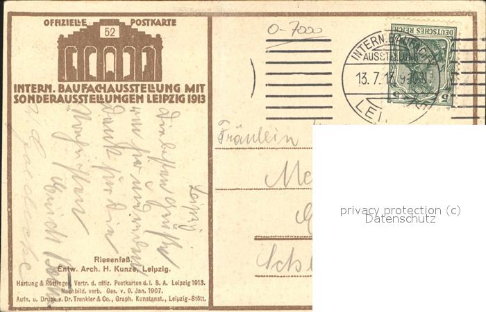 41527634 alte Postkarte LEIPZIG Sachsen Int.Baufachausstellung 1913 (Riesen-Fass) Sonderstempel postalisch gelaufen Erhaltung siehe scans KatCode: 11110014365000