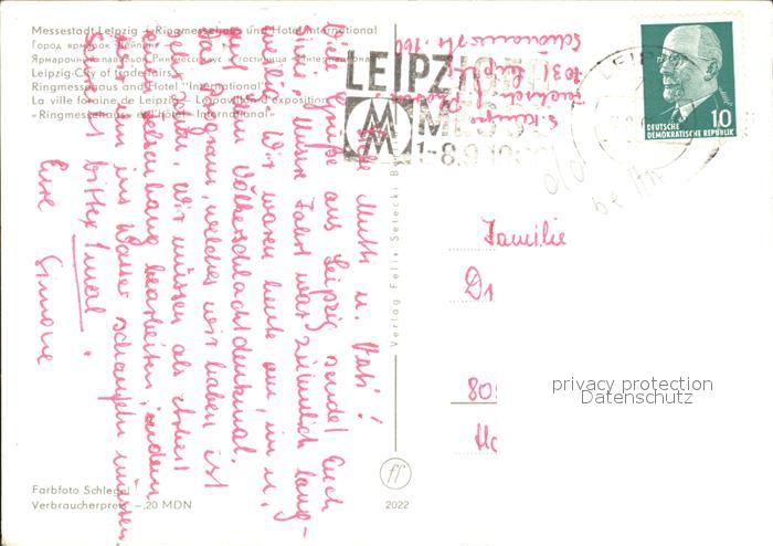 72393738 alte Postkarte LEIPZIG Sachsen Ringmessehaus und Hotel International postalisch gelaufen Erhaltung siehe scans KatCode: 11110014365000