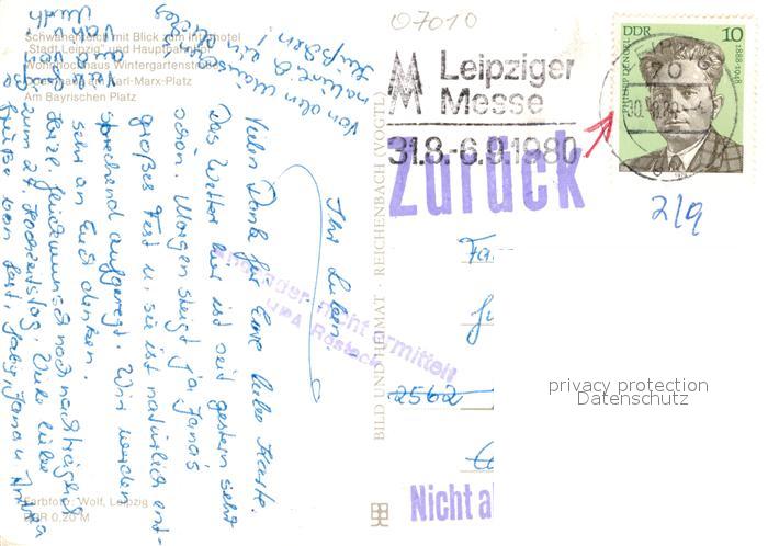 72958217 alte Postkarte LEIPZIG Sachsen Schwanenteich Interhotel Bahnhof Wohnhochhaus Opernhaus Karl Marx Platz Bayerischer Platz postalisch gelaufen Erhaltung siehe scans [FriedD77] KatCode: 11110014365000