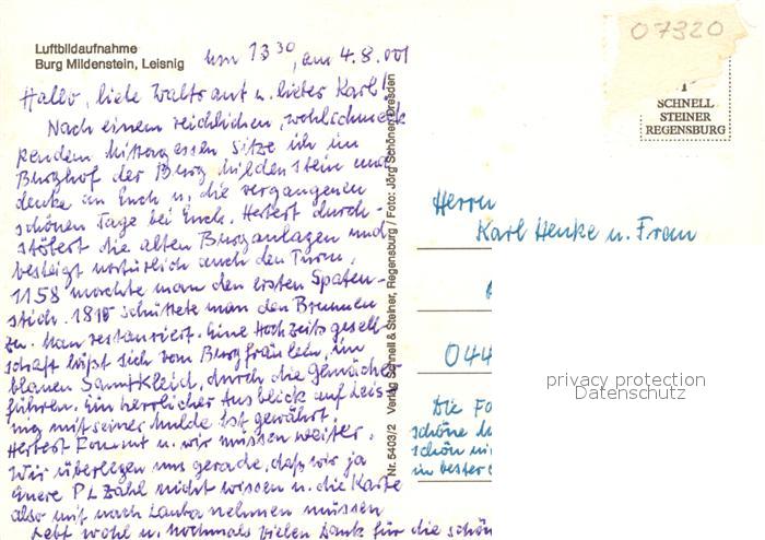 73129314 alte Postkarte Leisnig Fliegeraufnahme Burg Mildenstein postalisch gelaufen Erhaltung siehe scans [LiesaD40] KatCode: 11110014375090