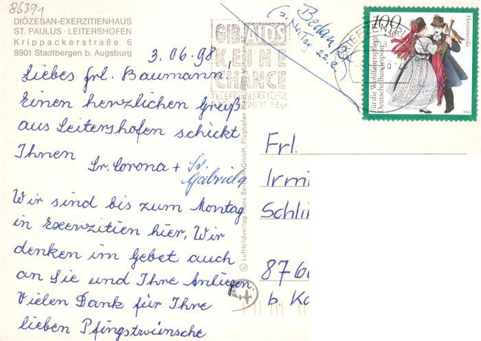 73874933 alte Postkarte Leitershofen Stadtbergen Bayern Dioezesan-Exerzitienhaus St. Paulus postalisch gelaufen Fliegeraufnahme Erhaltung siehe scans [FriedD77] KatCode: 11110009772202