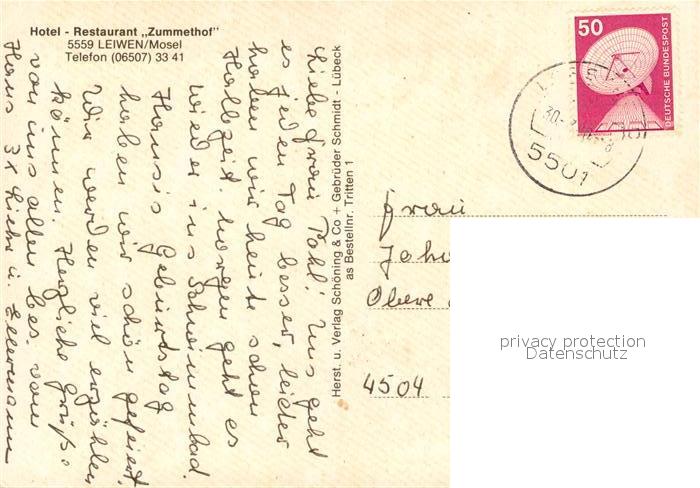 73129288 alte Postkarte Leiwen Mosel Fliegeraufnahme Moselschleife Hotel %re Zummethof postalisch gelaufen Erhaltung siehe scans [LiesaD40] KatCode: 11110007235074