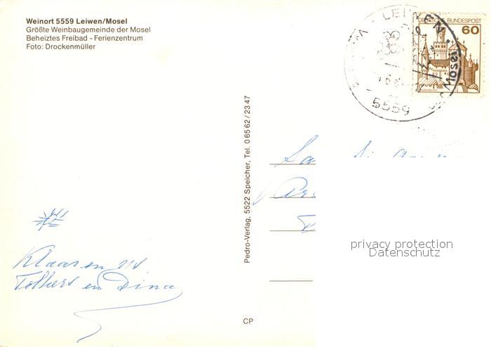 72933597 alte Postkarte Leiwen Mosel Kirche Panorama Schwimmbad Markt Brunnen postalisch gelaufen Erhaltung siehe scans [WerneD78] KatCode: 11110007235074