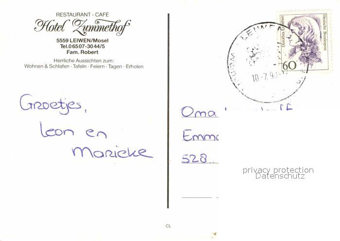 72864904 alte Postkarte Leiwen Mosel Restaurant Hotel Zummethof postalisch gelaufen Erhaltung siehe scans [NatalD47] KatCode: 11110007235074