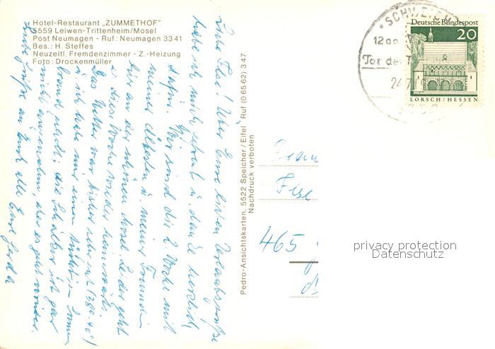 73570202 alte Postkarte Leiwen Trittenheim Mosel Hotel-Restaurant Zummethof postalisch gelaufen Erhaltung siehe scans [PaolaD17] KatCode: 11110007231207
