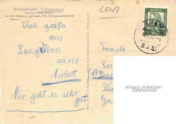 74092621 alte Postkarte Lelm Koenigslutter am Elm Helmstedt Niedersachsen Waldgaststaette Tetzelstein postalisch gelaufen Erhaltung siehe scans [WerneD78] KatCode: 11110003154013