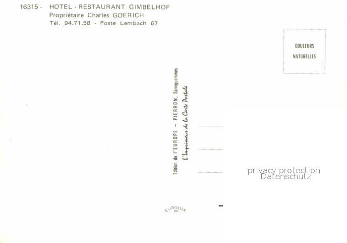 12916004 Lembach Bas Rhin Elsass Hotel Restaurant Gimbelhof postalisch nicht gelaufen Erhaltung siehe scans [NatalD47] KatCode: 11170067767263