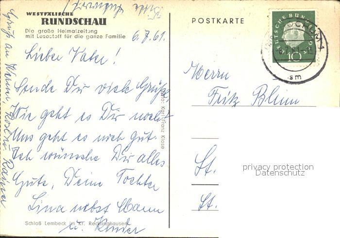 72092064 alte Postkarte Lembeck Schloss postalisch gelaufen Erhaltung siehe scans KatCode: 11110005562012