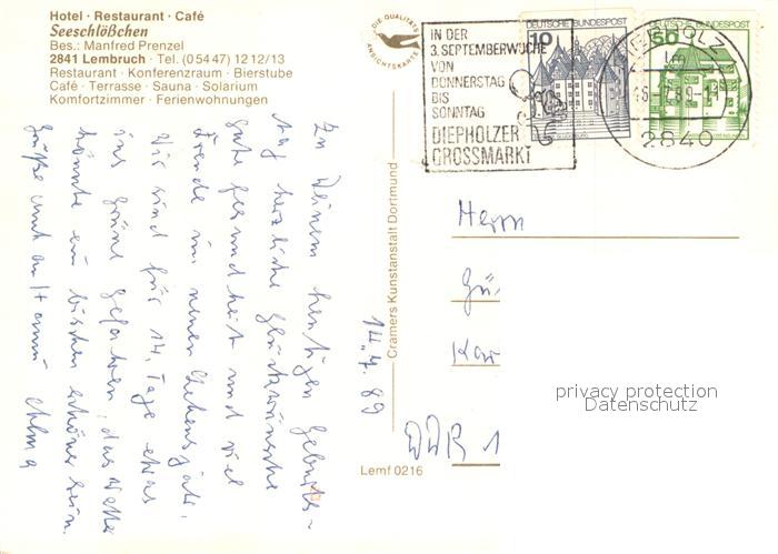 73717342 alte Postkarte Lembruch Hotel Restaurant Seeschloesschen Gastraeume Zimmer Segelschiffe postalisch gelaufen Erhaltung siehe scans [WerneD78] KatCode: 11110003251022