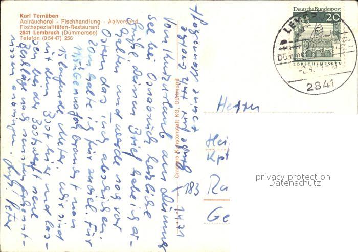 72458160 alte Postkarte Lembruch Karl Ternaeben Aalraeucherei Fischhandlung Fischspezialitaeten Restaurant postalisch gelaufen Erhaltung siehe scans KatCode: 11110003251022