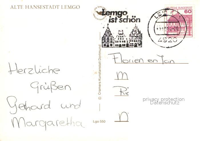 72936516 alte Postkarte Lemgo Lippe NRW Altstadt Fachwerkhaeuser Planetenhaus Mittelstrasse Brunnen Markt Hansestadt postalisch gelaufen Erhaltung siehe scans [FriedD77] KatCode: 11110005766044