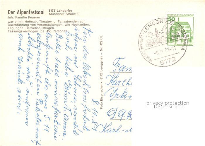 73324242 alte Postkarte Lenggries Alpenfestsaal Festsaal Blumengesteck postalisch gelaufen Erhaltung siehe scans [FriedD77] KatCode: 11110009173135