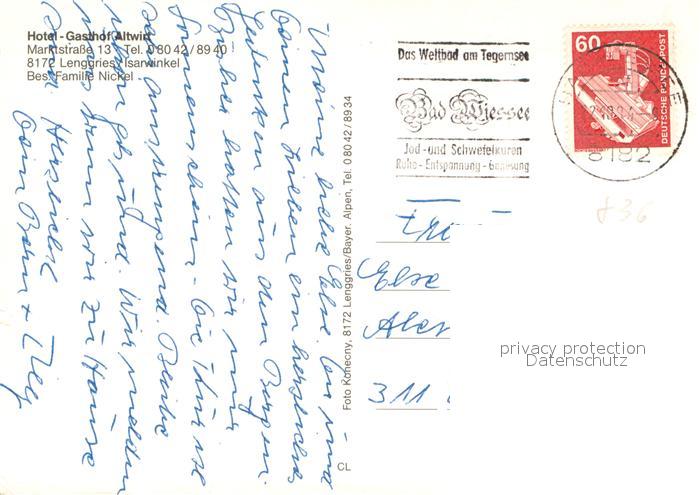 73651450 alte Postkarte Lenggries Hotel Gasthof Altwirt postalisch gelaufen Erhaltung siehe scans [WerneD78] KatCode: 11110009173135