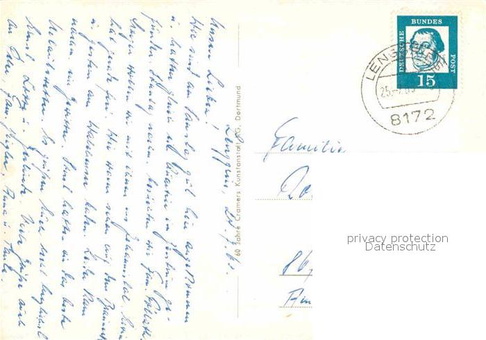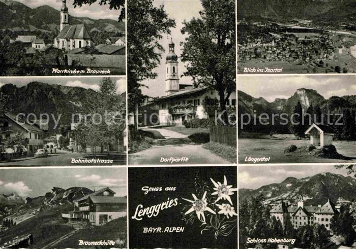 72822311 alte Postkarte Lenggries Pfarrkirche Brauneck Bahnhofstrasse Schloss Hohenburg Dorfpartie postalisch gelaufen Erhaltung siehe scans [AndreD76] KatCode: 11110009173135