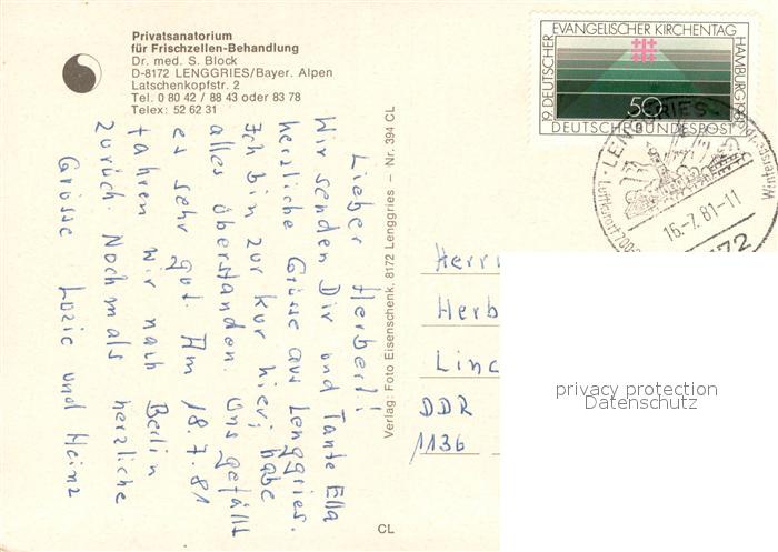 73653048 alte Postkarte Lenggries Privatsanatorium fuer Frischzellen Behandlung postalisch gelaufen Erhaltung siehe scans [WerneD78] KatCode: 11110009173135