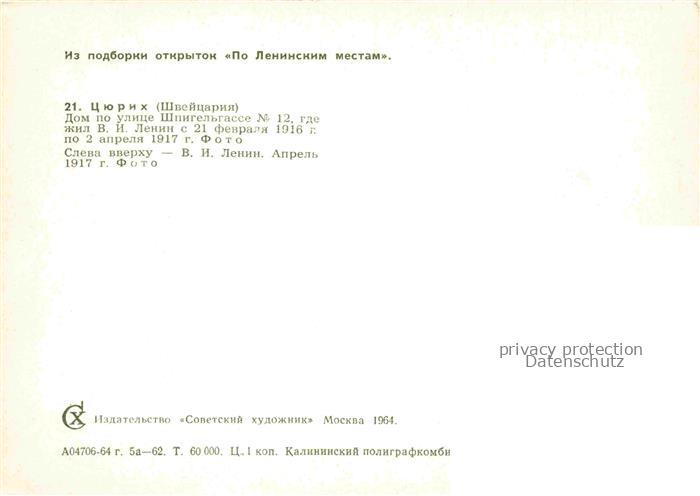74042278 LENIN Wladimir Iljitsch Politik Politics Politique Zuerich Spiegelgase 12 Wohnung postalisch nicht gelaufen Erhaltung siehe scans [IrynaD87] KatCode: 22420000000300