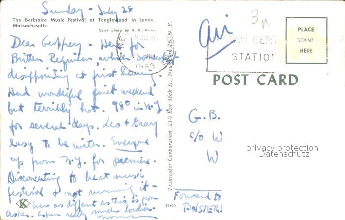 72316472 old postcard Lenox Massachusetts Berkshire Music Festival postalisch gelaufen Erhaltung siehe scans KatCode: 14140230000000