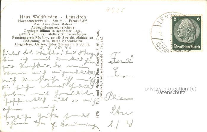 71510498 alte Postkarte Lenzkirch Hochschwarzwald BW Haus Waldfrieden postalisch gelaufen Erhaltung siehe scans KatCode: 11110008315068