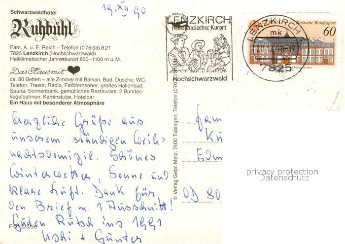 73791783 Lenzkirch Hochschwarzwald BW Schwarzwaldhotel Ruhbuehl postalisch gelaufen Erhaltung siehe scans [WerneD78] alte Postkarte Wern Katcode 11110008315068